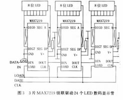 AT89C52的P3.0接MAX7219的串行数据输入端DIN,在CLK的上升沿,串行数据从DIN装入到内部16位移位寄存器中。在CLK下降沿的DOUT端数据有效。本系统采用3片MAX7219进行级联,来驱动24个LED数码管,分别显示电池的4个参数值及各分档测量值的统计结果。图3为3片MAX7219级联驱动24个LED数码管。
